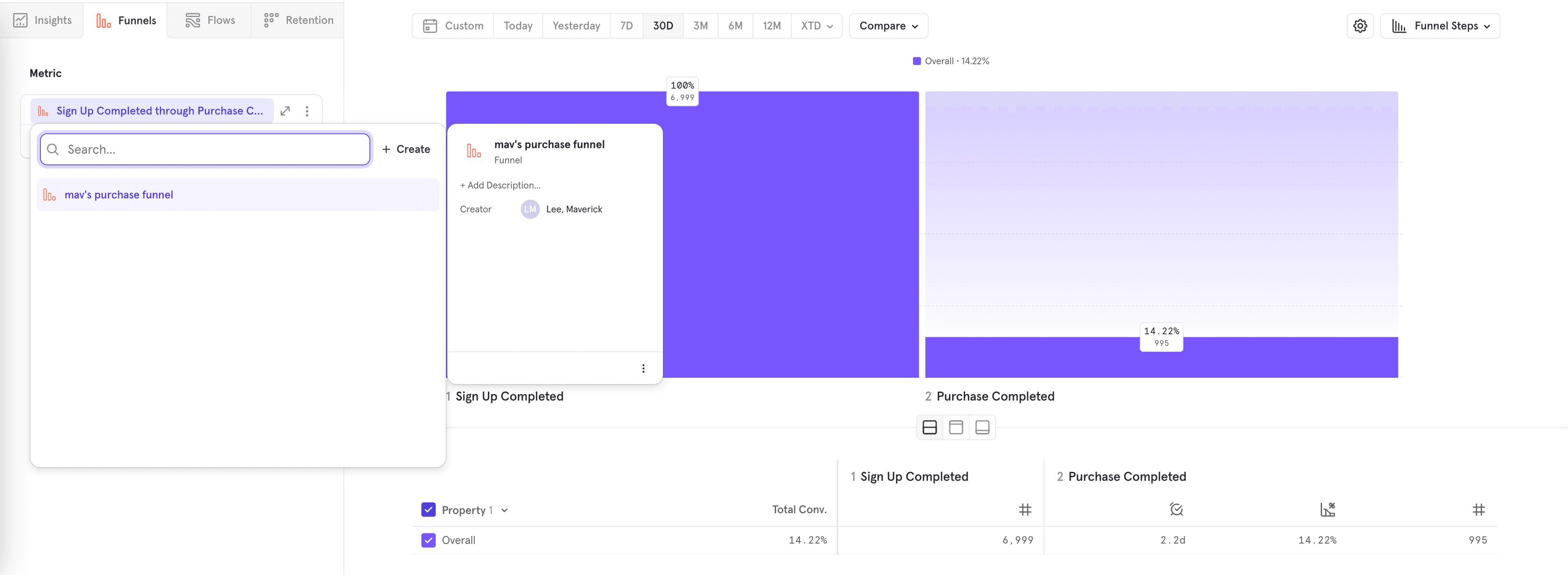 After your funnel is defined, you can choose how you want to measure the funnel. By default, Funnels report will select conversion rate of the funnel as the measurement, but you can also measure the number of users converting, total conversions, and more. You can change the measurement by selecting “Conversion Rate” in the bottom left of the funnel metric definition. In this case, we don’t want to change the measurement, so it can be left alone.